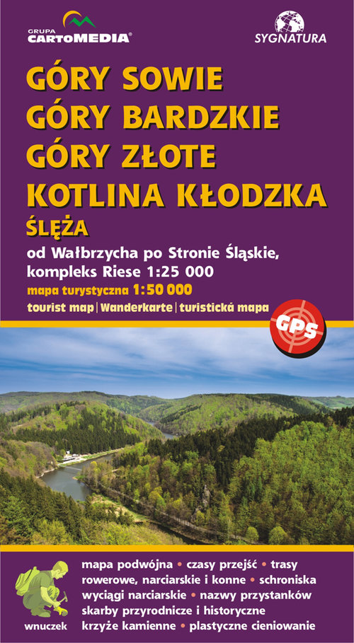 Góry Sowie, Bardzkie, Złote. Kotlina Kłodzka, Ślęża. Skala 1:50 000. Cztery mapy w jednej. Na mapie czasy przejść, szlaki piesze, rowerowe, konne i narciarskie. Wyciągi narciarskie, nazwy przystanków, skarby przyrodnicze i historyczne, schroniska, krzyże kamienne, plastyczne cieniowanie.