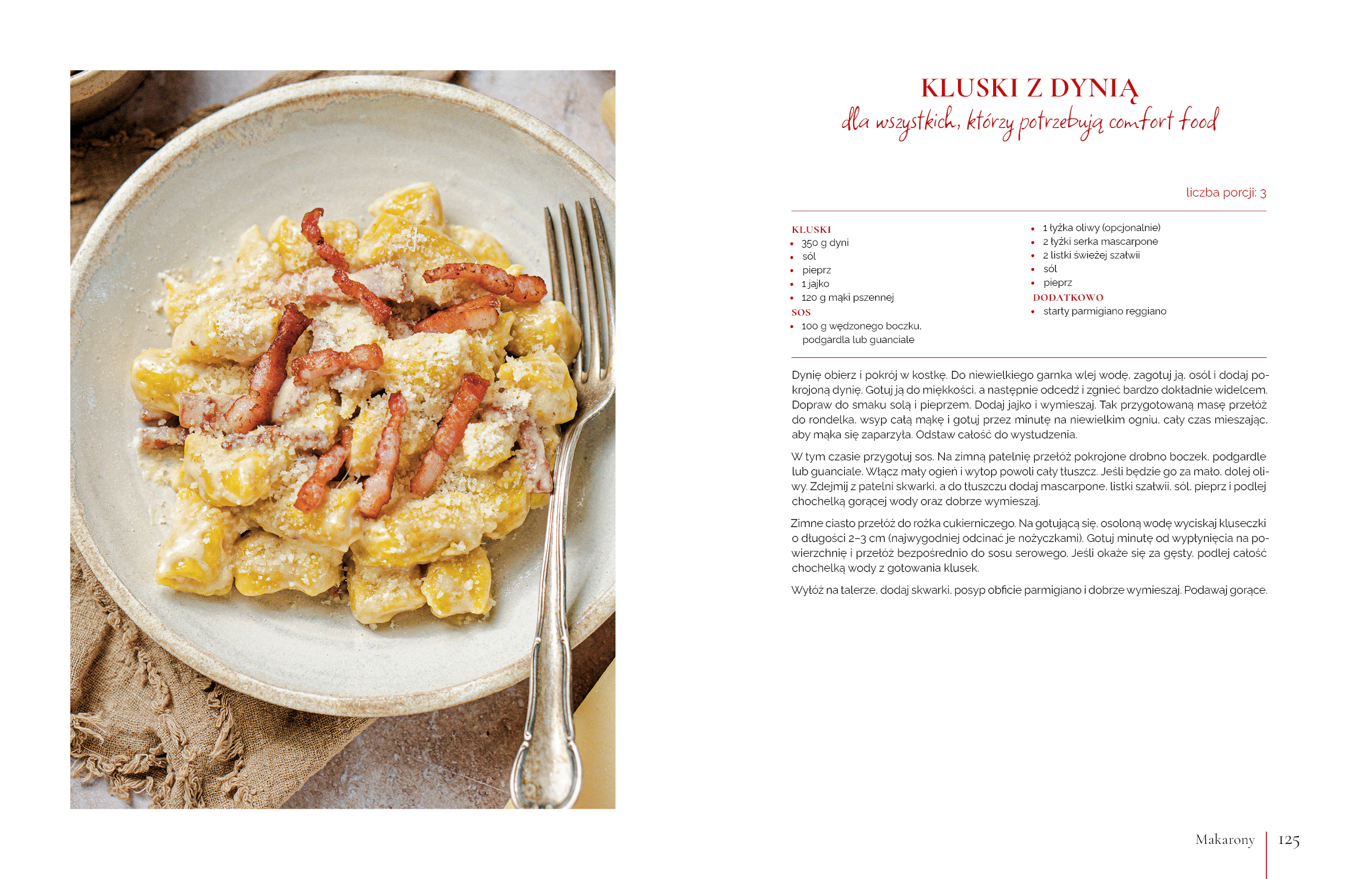 Z Ewą przyrządzisz absolutne klasyki, takie jak prosta, ale pełna charakteru carbonara czy gorące pierogi przesmażane z aromatyczną cebulką. Zachwyci cię też mnóstwo mniej znanych smaków - mięciutkie toskańskie kluseczki gnudi z masłem szałwiowym i parmezanem, podlaskie zaguby, syte i pachnące majerankiem...