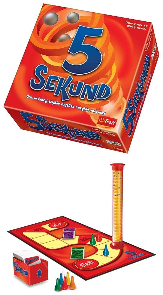 Lubisz adrenalinę? Polubisz 5 sekund! Zmierz się z czasem w nowej grze towarzyskiej, w której szybko myślisz i szybko mówisz. Gracze ustawiają na środku pudełko z kartami i losują pytanie, na które odpowiada gracz siedzący na Gorącym Krześle. Kiedy usłyszy pytanie, wystartuje czasomierz odmierzający dokładnie 5 sekund przeznaczonych na udzielenie 3 poprawnych odpowiedzi. Zrób to jednocześnie: wymyśl odpowiedzi, kontroluj czas i postaraj się nie skupiać na rozpraszających kulkach przesuwających się po spirali czasomierza. W przypływie adrenaliny możesz nie wiedzieć, czy na pewno udzieliłeś poprawnych odpowiedzi – nie przejmuj się, Twoi przeciwnicy chętnie to ocenią! Jeśli Ci się udało, przesuwasz swój pionek w stronę mety. Jeśli się pomyliłeś albo nie udzieliłeś 3 odpowiedzi, pytanie przechodzi na następnego gracza. Zrobi się gorąco, bo odpowiedzi nie mogą się powtarzać. Wygrywa ten, komu uda się najszybciej przejść planszę. Gracze mogą posłużyć się kartami, dzięki którym zamienią pytanie lub przekażą je przeciwnikowi. Decyzję trzeba podjąć w 5 sekund: grać, czy ryzykować, że przeciwnik odpowie poprawnie? Uważaj w strefie zagrożenia – jeśli tu jesteś, nie możesz być pewien, czy zaraz znajdziesz się na mecie, czy stracisz kolejkę. Pewne jest, że będziesz się świetnie bawić! Zawartość pudełka: 372 karty z pytaniami (744 pytania) 6 kart „Następny” 6 kart „Zmiana” 6 pionków Specjalny czasomierz Plansza Instrukcja Wiek graczy: 8+ Liczba graczy: 3-6