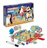Uwaga pingwiny! Należy przeprowadzić specjalne szkolenie taktyczne! Skipper wpadł na pomysł podniesienia zdolności bojowych swojego zespołu, dlatego zarządził symulację desantu na bazę wroga. Gracze dowodzą wybranym zespołem pionków: czerwonym lub niebieskim. Każdy z graczy musi spróbować pokonać rywala - zbijać jego pionki strzałami katapulty lub pobić go za pomocą swoich pionków. Zwycięża ten, kto zbije wszystkie pionki rywala lub zdoła swoim pionkiem dotrzeć do bazy przeciwnika. Każdy z graczy posiada w swoim zespole 3 tajnych Agentów, którzy mogą zmylić przeciwnika i pokrzyżować jego plany. Czy potrafisz swoim sprytem i taktyką zdobyć bazę przeciwnika, zanim on opanuje twoją? Zawartość pudełka: dwustronna plansza, 36 pionków, 4 katapulty, 10 kulek, 4 karty specjalne,30 podstawek do pionków, 5 trofeów, żeton zwycięzca, flamaster, instrukcja.