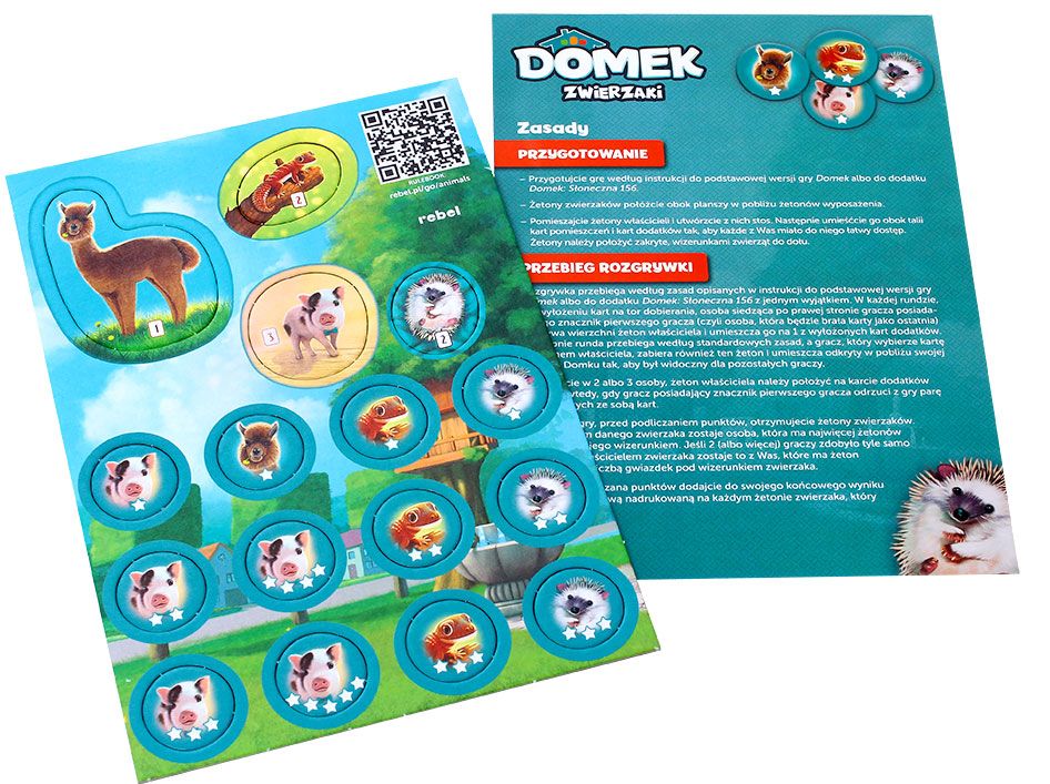 Dodatek Domek: Zwierzaki wprowadza do gry Domek 4 żetony zwierzaków i 12 żetonów właścicieli.