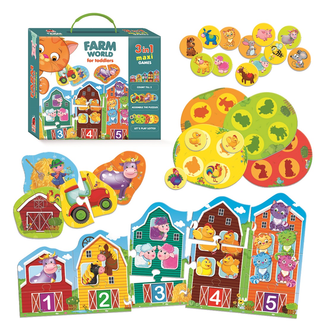 Wielki zestaw edukacyjny 3 w 1: Farma. Przy pomocy wielkiego zestawu edukacyjnego poznawajcie wiejskie zwierzęta oraz cyfry do 5.