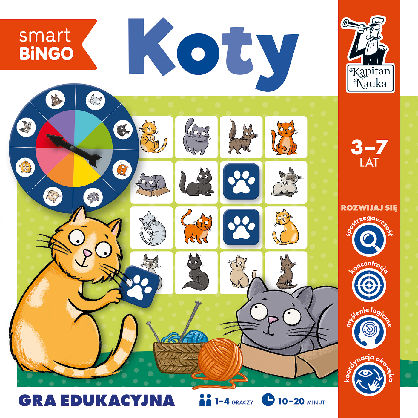 Gra edukacyjna Koty. Smart bingo (37 lat) została przygotowana z myślą o przedszkolakach. Umożliwia ona wiele wariantów rozgrywek. Najprostszy polega na wyszukiwaniu kocich kłębków i zabawek w tym wylosowanym kolorze na swojej planszy i zaznaczeniu czterech sąsiadujących ze sobą pól na planszy (w pionie, poziomie lub po skosie). W nieco trudniejszej wersji gracze szukają kotów tej samej rasy (i koloru), które mogą jednak przybierać różne pozy na planszy, inne niż na kole losującym. Dla zaawansowanych zawodników przygotowano wariant z elementami planowania strategii. Aby zdobyć pasek zwycięstwa, można zaznaczyć tylko jedno pole z dwóch pasujących, gracz musi więc zdecydować, który ruch przybliży go do zwycięstwa.