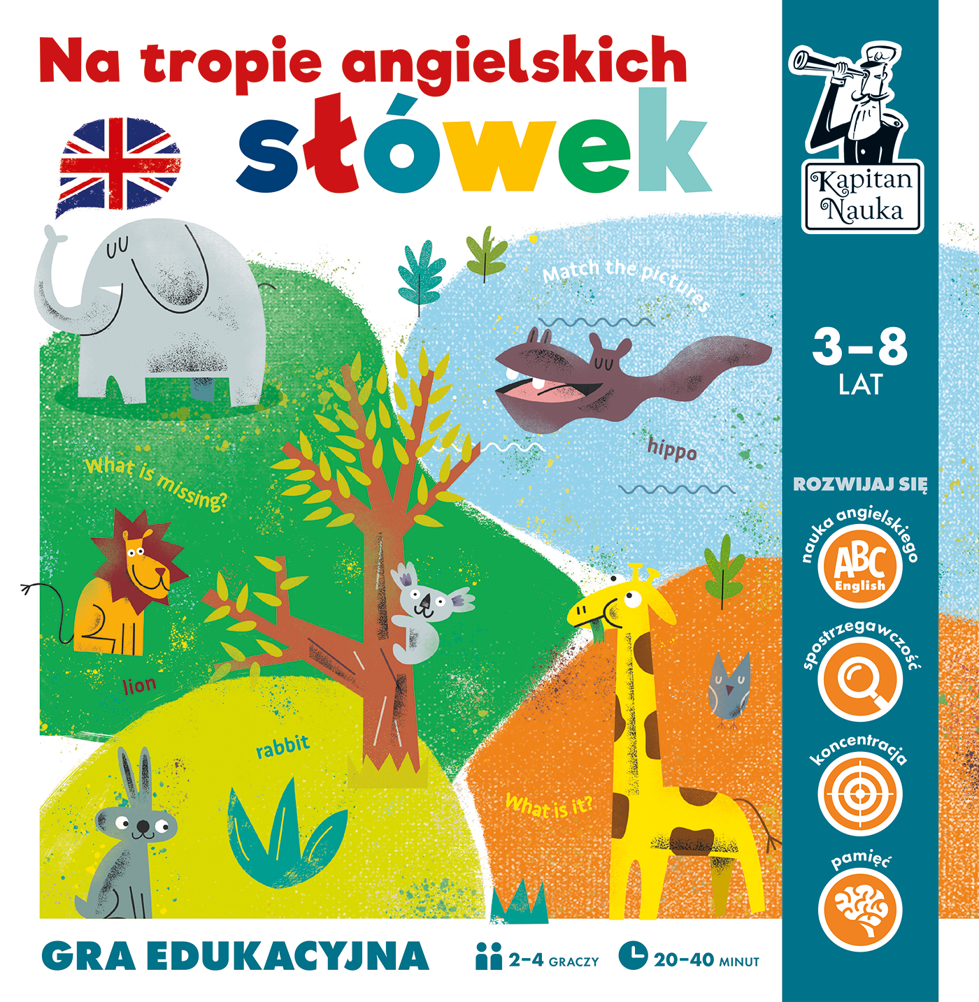 Na tropie angielskich słówek to edukacyjna gra planszowa typu wyścig przeznaczona dla przedszkolaków i wspierająca naukę podstawowych zwrotów w języku angielskim. Stanowi znakomity wstęp do poznania najprostszych słówek i podstaw gramatyki.