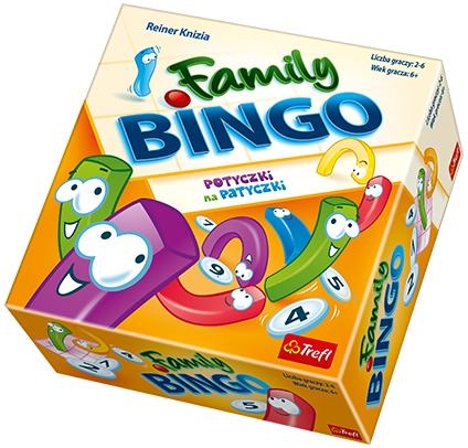 Family BingoCzy macie ochotę na zabawę w gronie rodziny lub przyjaciół? Czy chcecie sprawdzić swoją zręczność, wiedzę i pamięć? Czy pragniecie poczuć ducha rywalizacji? Bingo! Family Bingo to gra, w której czeka na Was 165 zadań w 8 kategoriach wymagających różnych umiejętności. Wszystkie zadania wykorzystują kolorowe drewniane patyczki, które będziecie układać, przekładać, chować, a nawet rzucać. Potyczki na patyczki czas zacząć!RozgrywkaCelem gry jest ułożenie 4 żetonów z cyframi w rzędzie na swojej planszetce (pionowo, poziomo lub ukośnie). Żetony gracze zdobywają biorąc udział w zadaniach z wykorzystaniem patyczków.Gra rozgrywana jest w rundach, w których uczestniczą wszyscy gracze. Najstarszy gracz zostaje Prowadzącym. Funkcja Prowadzącego co rundę przechodzi na kolejnego gracza. Na początku rundy Prowadzący losuje jeden duży żeton z liczbą. Następnie Prowadzący ciągnie kartę ze stosu i odczytuje zadanie. Zależnie od zadania, jest ono rozgrywane w sposób opisany na karcie. Gracze, którzy wykonali zadanie i zdobyli punkt, kładą mały żeton z liczbą na swojej planszetce w odpowiednie miejsce.Gracz, który jako pierwszy ułoży cztery żetony w rzędzie (pionowo, poziomo lub ukośnie), wygrywa grę. Jeśli dokona tego kilku graczy w tej samej rundzie - mamy remis.Zadania Kto pierwszy, ten lepszy - Gracze układają z patyczków konstrukcje na czas. Tutaj liczy się szybkość. Liczbowe potyczki - Gracze odpowiadają na pytania, chowając w dłoni odpowiednią ilość patyczków. W tej kategorii odpowiedzią na pytanie jest zawsze liczba. Przyda się umiejętność liczenia. Mistrz pamięci - Gracze łącznie z Prowadzącym mają za zadanie zapamiętać konstrukcję na karcie i zbudować ją w sekrecie przed innymi. Dobra pamięć to podstawa. Mistrz wiedzy - Prowadzący czyta pytanie. Wszyscy chowają w dłoni patyczek w kolorze wybranej przez nich odpowiedzi. Punkt otrzymują gracze, którzy schowali w dłoni patyczek we właściwym kolorze. Kto wykaże się największą wiedzą ogólną? Mistrz zręczności - Prowadzący czyta zadanie, a gracze wykonują je po kolei, począwszy od Prowadzącego. Zasady przyznawania punktów opisane są na poszczególnych kartach. Prawdziwy sprawdzian zręczności. Sekretna konstrukcja - Prowadzący dyskretnie patrzy na rewers karty. Opisuje pozostałym graczom konstrukcję, którą widzi. Gracze za zasłonkami budują opisywaną konstrukcję. Kluczem w zabawie będzie wyobraźnia. Szczęśliwe patyczki - Prowadzący czyta zadanie. Następnie Prowadzący lub wszyscy gracze biorą dyskretnie do ręki określoną liczbę patyczków. Zasady przyznawania punktów opisane są na poszczególnych kartach. Zdolność przewidywania i łut szczęścia na pewno się przydadzą.  Zgadnij, co to? - Prowadzący dyskretnie patrzy na rewers karty. Następnie próbuje odwzorować z patyczków przedstawiony tam obiekt. Punkt otrzymuje gracz, który pierwszy odgadnie, co znajduje się na rewersie karty. Czy jesteście spostrzegawczy?Zawartość pudełka: 165 kart z zadaniami 96 patyczków w 6 kolorach 16 dużych żetonów z liczbami 96 małych żetonów z liczbami 6 zasłonek dla graczy - instrukcja