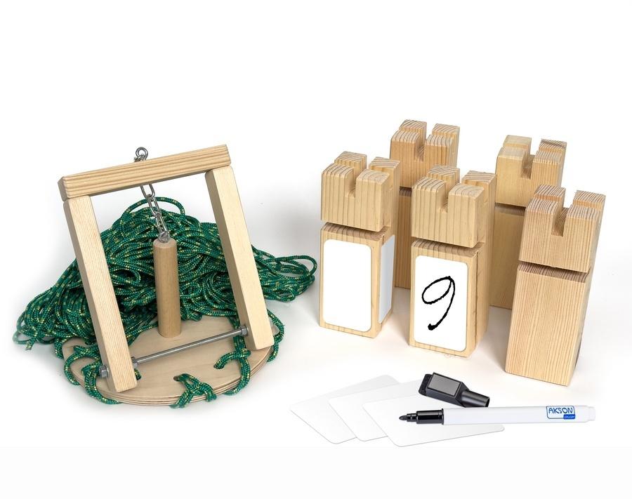 - Rozłóż klocki losowo na podłodze. Każdy gracz trzyma jeden lub dwa sznurki dźwigu. Sznurkami należy wspólnie unieść klocki tak, by powstała z nich wieża.
