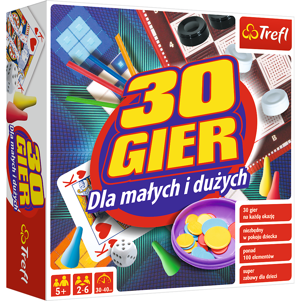 Kalejdoskop 30 gierZestaw popularnych gier przygotowany z myślą o zabawie z najmłodszymi i doskonały sposób na spędzenie wolnego czasu w rodzinnym gronie. W komplecie znajduje się instrukcja 30 gier i mnóstwo akcesoriów niezbędnych do emocjonujących rozgrywek. Z pewnością pchełki, chińczyk, domino i inne wspaniałe gry poprawią humor każdemu dziecku.