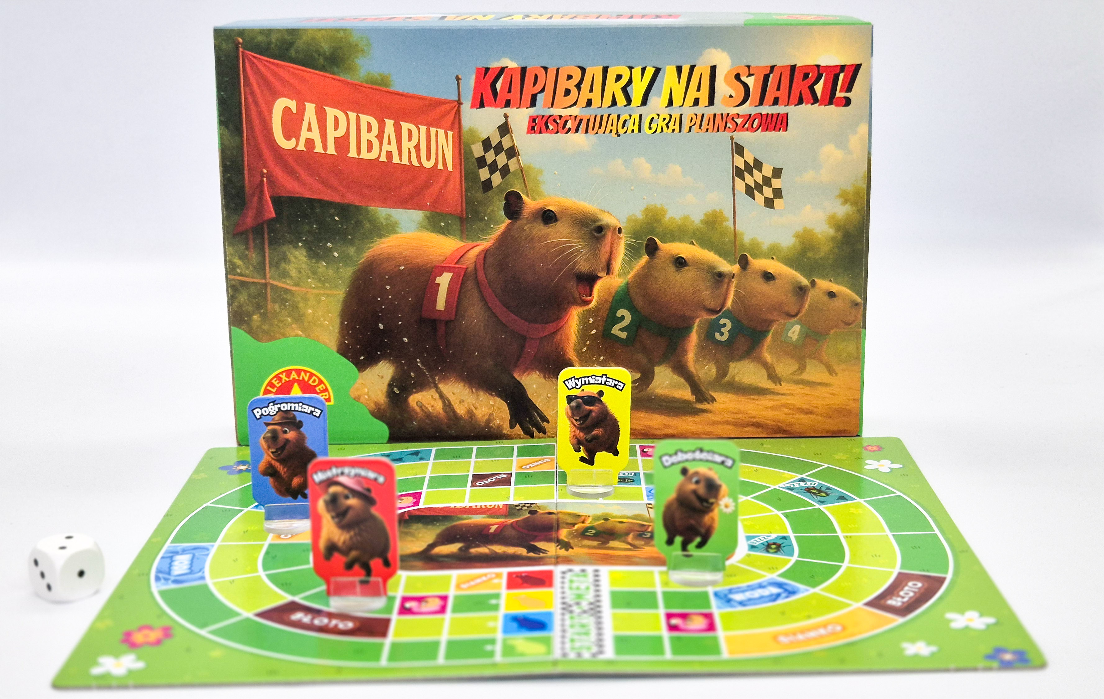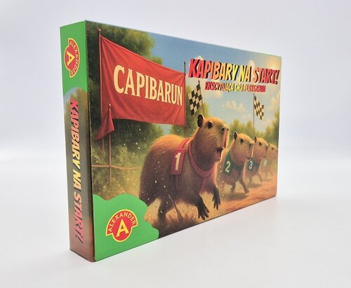 "Kapibary na Start – wyścigowa gra planszowa dla dzieci od 5 lat Wybierz swojego zawodnika i rozpocznij wielką kapibarową gonitwę! Uwaga, uwaga! Przed Wami wielki wyścig na Kapibarodromie! Do boju ruszają cztery wyjątkowe zawodniczki: słynna Kapibara Wymiatara, czujna Debeściara, niepokonana Mistrzyniara i arcygroźna Pogromiara. Kto pierwszy pokona trasę cztery razy i zgarnie wszystkie pchełki zwycięstwa? Kapibary na Start to pełna emocji i humoru gra planszowa dla dzieci już od 5. roku życia. Dzięki prostym zasadom i dynamicznej rozgrywce doskonale sprawdzi się jako pierwsza planszówka dla młodych graczy. Kapibary nie znają litości – liczy się szybkość, spryt i trochę szczęścia! Rozgrywka jest prosta: rzucasz kostką i przesuwasz swoją kapibarę po torze. Ale uwaga – na trasie czekają różne niespodzianki! Błotniste pola mogą Cię spowolnić, sianko doda Ci energii, a woda przyspieszy Twój ruch. Może trafi się też relaks albo… natrętna mucha, która popsuje Twoje plany! Za każde pełne okrążenie toru otrzymujesz znacznik zwycięstwa. Zwycięża ten, kto jako pierwszy zbierze cztery! Dlaczego pokochasz Kapibary na Start? • Wesołe kapibary z charakterem i własnymi pseudonimami • Prosta i szybka rozgrywka – idealna gra dla całej rodziny • Emocje do ostatniego rzutu kostką • Rozwija koncentrację i umiejętność czekania na swoją kolej • Wyprodukowano w Polsce – bezpieczna i trwała zabawa Idealna gra planszowa na rodzinne popołudnie Szukasz pomysłu na prezent, który wciągnie całą rodzinę? Kapibary na Start to świetna opcja dla 2–4 graczy – idealna do wspólnej zabawy, śmiechu i zdrowej rywalizacji. Dzieci błyskawicznie zrozumieją zasady i same będą chciały rozgrywać kolejne partie. "