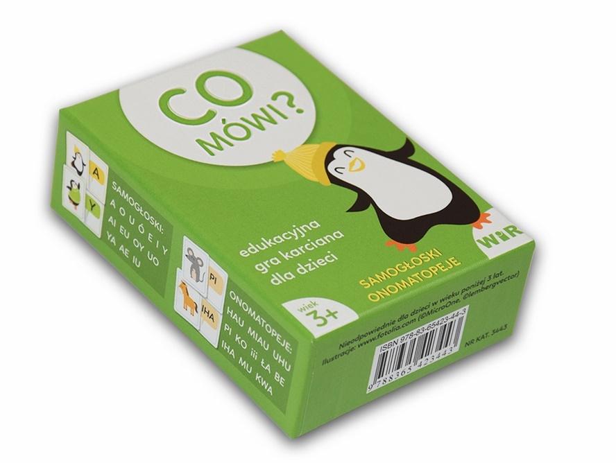 Co mówi? Samogłoski i onomatopeje"" to edukacyjna gra karciana przeznaczona dla dzieci od 3. roku życia.