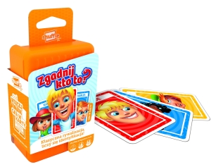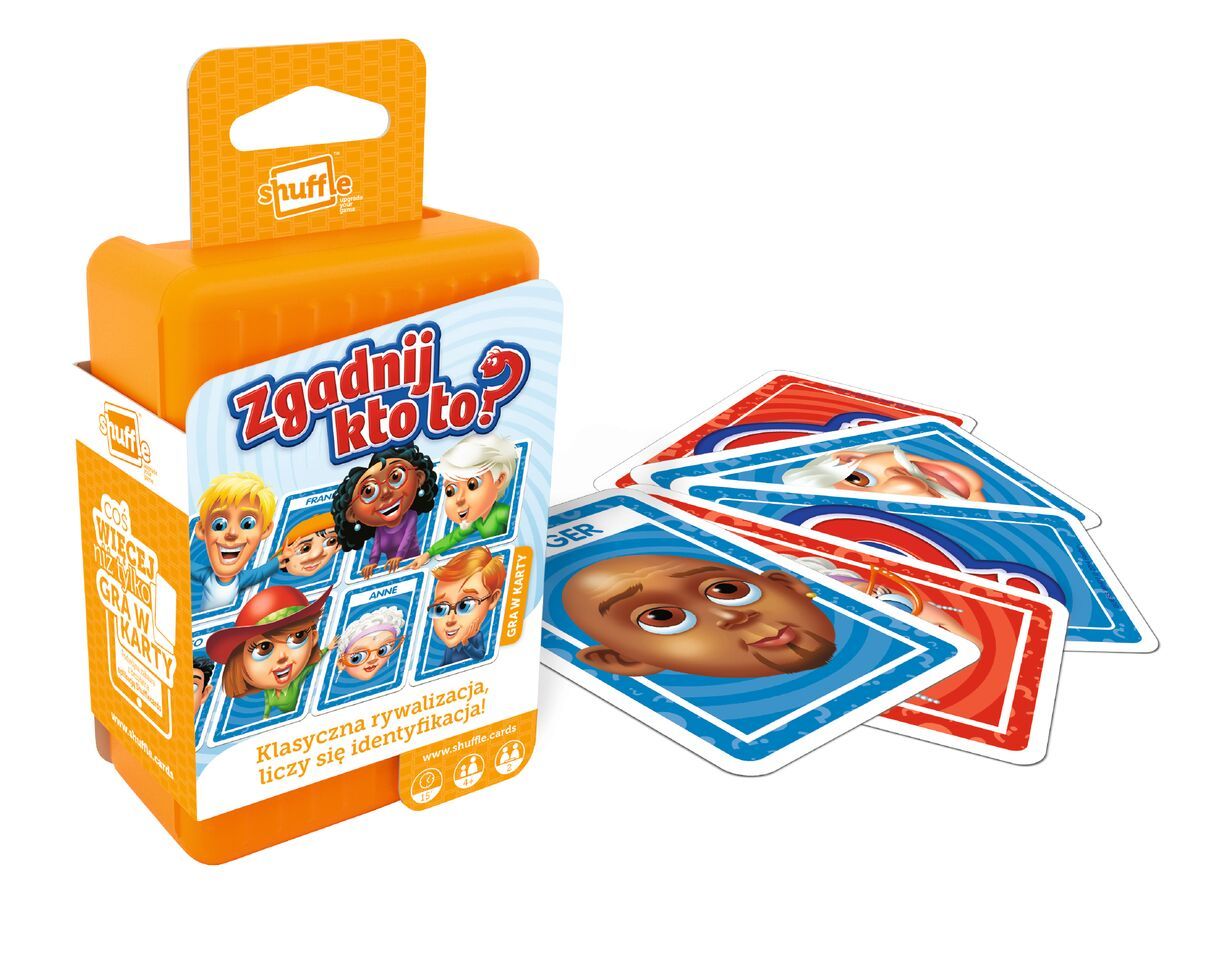 emGry karciane Shuffle Twoje ulubione gry z cyfrowym twistem!Doskonała zabawa w domu i w podróży.Shuffle czyli nowe, wciągające i szybkie gry karciane dla wszystkich grup wiekowych. Do gier dostępne są bezpłatne aplikacje (do pobrania z App Store i Google Play) cyfrowy dodatek, który uatrakcyjni całą zabawę.Shuffle to wspaniałe gry w nowoczesnym opakowaniu oraz doskonała zabawa.Zgadnij kto to? klasyczna rywalizacja, liczy się identyfikacja!Zgadnij, kim jest postać drugiego gracza, zadając pytania na temat jej wyglądu. Czy jest to kobieta? Czy nosi okulary? Czy ma brązowe włosy? Czy nosi kapelusz?Pobierz darmową aplikację Shuffle app, aby urozmaicić grę, przerabiając zdjęcia członków rodziny lub znajomych na wizerunki postaci Zgadnij kto to!Zawartość: 60 kart, instrukcja, bezpłatna aplikacja ShuffleCzas grania: 15 min, liczba osób: 2, wiek: 4+