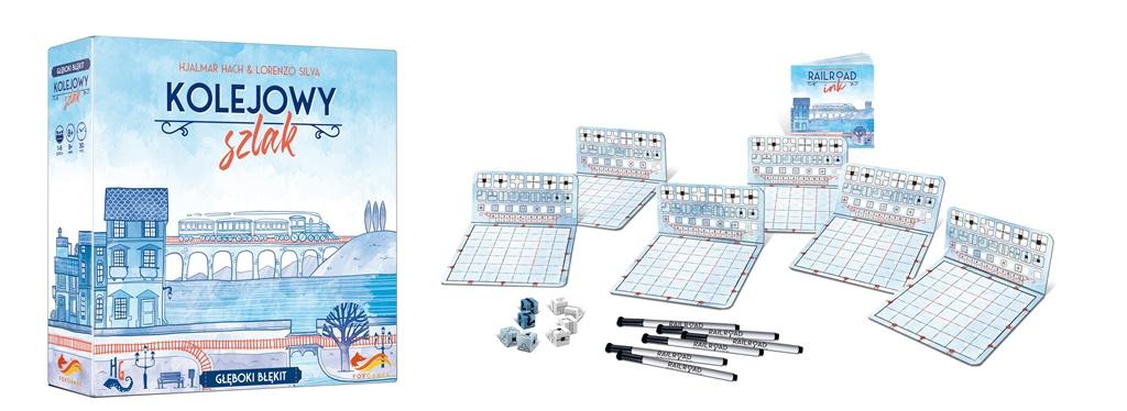 W Kolejowym szlaku gracze rzucają kośćmi, a następnie rysują trasy na swoich planszach. Pod koniec gry zdobywają punkty za swoje najdłuższe trasy oraz za stworzenie sieci połączeń. Muszą jednak uważać, bo za niezamknięte trasy mogą stracić punkty. Głęboki błękit pozwala na wprowadzenie do gry kostek jezior albo rzek. Dzięki nim zwiększy się możliwości punktowania. Jeziora pozwalają powiększyć sieci, a rzeki są nowym typem trasy. Łącząc Głęboki błękit z Płomienną czerwienią możesz zagrać nawet w 12 osób! Zawartość: 6 pisaków 4 kostki trasy 2 kostki rzeki 2 kostki jeziora 6 plansz instrukcja Liczba graczy 1-6 Wiek 8+