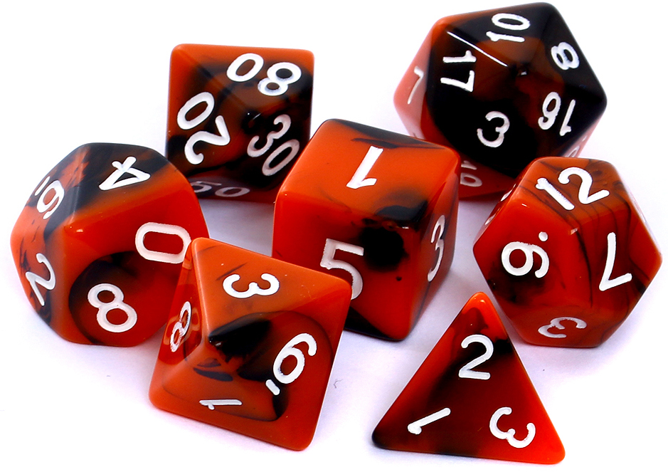 Komplet siedmiu dwukolorowych kości marki Rebel o unikalnym charakterze.