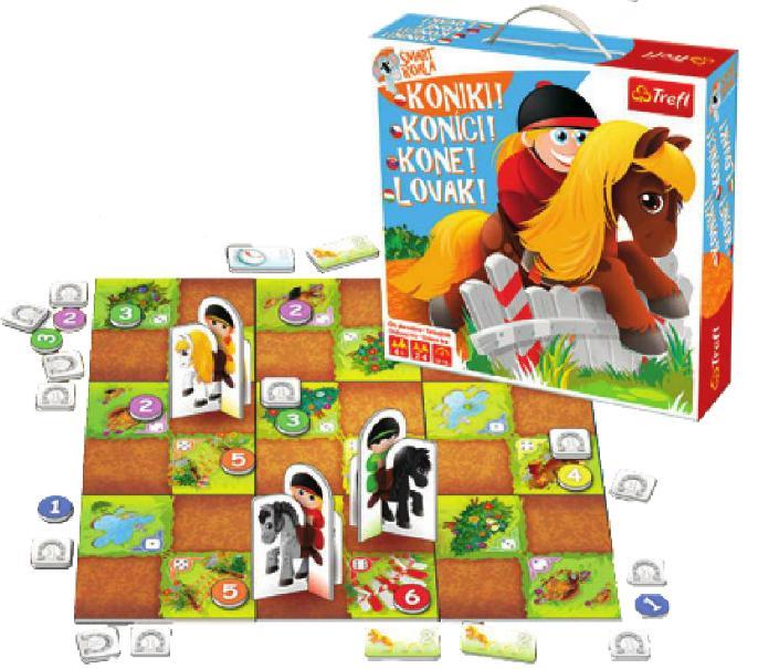 Dzisiaj na łące odbywają się zawody w skokach przez przeszkody. Wybierz swojego konika, wybierz swojego jeźdźca i ruszaj do boju! Kto uzbiera najwięcej punktów, zdobędzie fantastyczną statuetkę i tytuł Mistrza Łąki. Czy będziesz ostrożnie skakał tylko przez kałuże i domek pana Kreta, czy jednak spróbujesz przeskoczyć płot za stodołą? Wszystko zależy od twojej strategii i oczywiście – odrobiny szczęścia. Dzięki modułowej planszy każda rozgrywka wygląda inaczej, a specjalny system premiowania skoków sprawia, że gra jest naprawdę emocjonująca. Gracze docydują, które przeszkody chcą pokonać - łatwiejsze, czy trudniejsze. Następnie rzutem kostką rozstrzygają, czy skoki były udane. „Koniki” to doskonała gra dla dzieci, rozwijająca umiejętności matematyczne, zmysł planowania i wyobraźnię przestrzenną. Przyjazna grafika i proste zasady gry idealnie dostosowane są dla dzieci w wieku przedszkolnym i wczesnoszkolnym. Zawartość pudełka: 9-częściowa plansza 5 żetonów premii 5 żetonów statuetek 18 żetonów przeszkód 16 żetonów podków 4 jeźdzców 4 koniki kostka instrukcja Liczba graczy: 2-4 Wiek: 4+ Czas trwania gry: 10-15 min