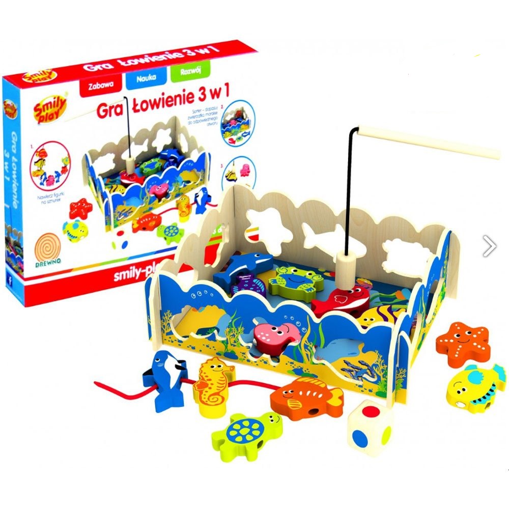 Gra Łowienie to drewniana zabawka która rozwija sprawne rączki, koordynację wzrokowo-ruchową i wyobraźnię przestrzenną. Graj: Łowienie rybek to fantastyczna gra, którą dzieci bardzo lubią. Gra przeznaczona jest dla 1 do 4 graczy. Pudełko w którym łowimy rybki to jeziorko, które trzeba samemu złożyć. 12 różnorodnych zwierzątek morskich można łowić na wędkę z magnesem. Rzuć kostką i złap zwierzątko morskie o takim samym kolorze. Jeśli nie ma już zwierzątka o wyrzuconym kolorze, przekaż kostkę następnemu graczowi. Wygrywa gracz, który złowi najwięcej zwierzątek. Sortuj: Na drewnianych ściankach pudełka wycięte są otwory. Dopasuj zwierzątko do odpowiedniego otworu. Nawlekaj: Wszystkie zwierzątka mają dziurki, dzięki temu dziecko może urozmaić swoją zabawę w nawlekanie je na specjalny sznureczek. Zabawy w nawlekanie rozwijają zdolności motoryczne, stymulują ośrodki mózgu odpowiedzialne za mowę. Zabawka rozwija: inteligencję, kreatywność, zdolności manualne, wyostrza zmysł koncentracji.