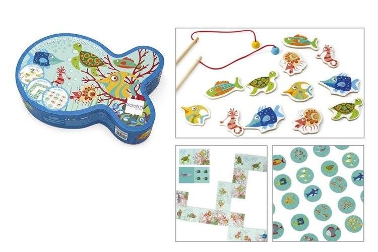 Dzięki grze dziecko poznaje liczby. Gra rozwija koordynację ruchowo-wzrokową, zręczność i cierpliwość. W zestawie znajduje się 12 drewnianych rybek (6x4x0.5cm) i dwie wędki wykonane z drewna, 28 sztuk domina (9.5x5cm) i 32 sztuk memo wykonane z tektury, a wszystko zapakowane jest w śliczne kolorowe pudełko w kształcie rybki.
