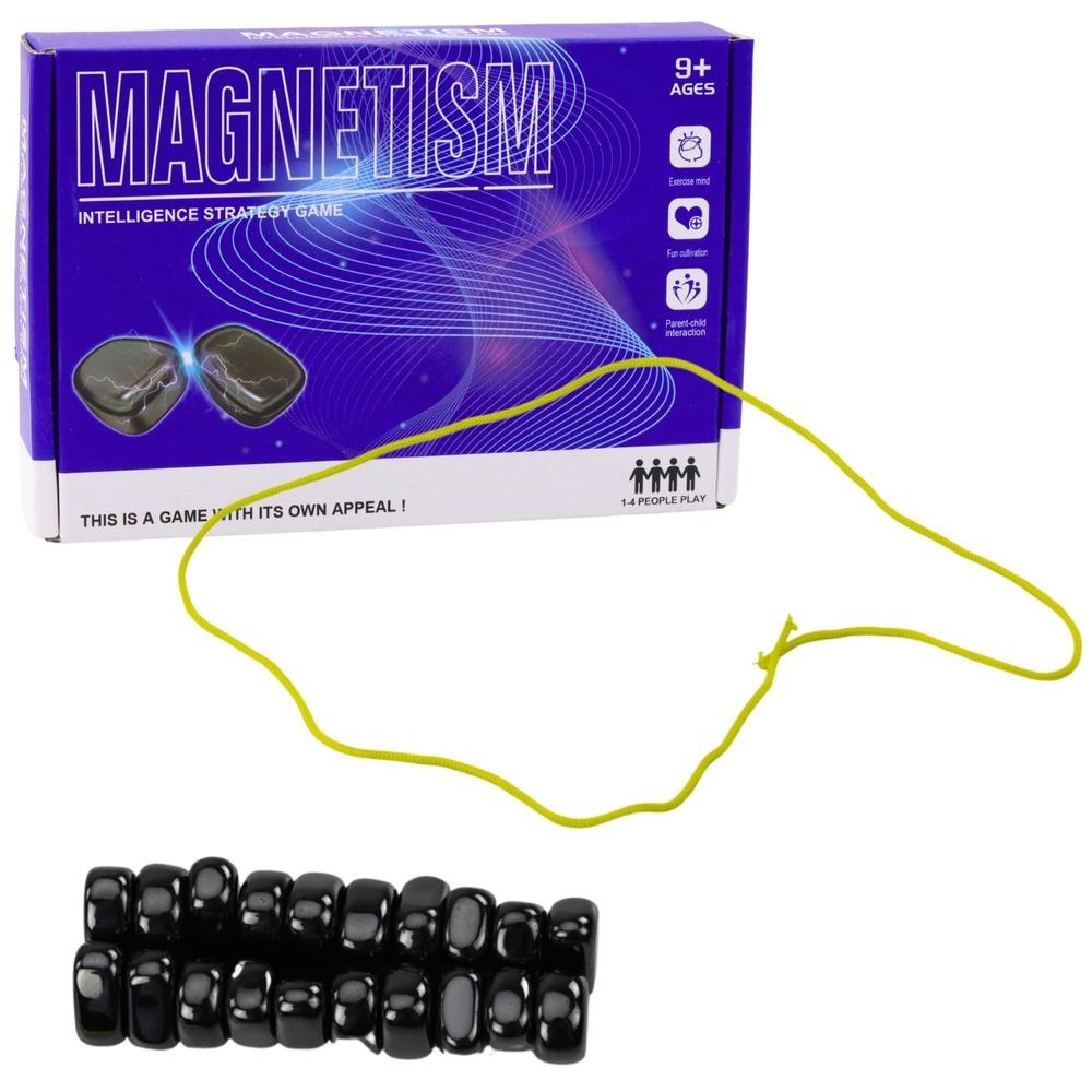 MAGNETYCZNA GRA - 20 KAMIENI + WOREK + SZNUREK Magnetyczna gra w kamienie to wciągająca zabawa logiczna dla dzieci i dorosłych, która łączy strategię, zręczność i emocjonującą rywalizację. Zestaw zawiera 20 magnetycznych kamieni, elastyczny sznurek tworzący pole gry oraz tkaninowy woreczek. Dzięki prostym zasadom gra szybko staje się ulubioną formą spędzania czasu w gronie rodziny i znajomych. Rozgrywka polega na naprzemiennym układaniu magnetycznych kamieni w obrębie pola wyznaczonego przez sznurek - tak, aby kamienie się nie połączyły. Jeśli podczas ruchu kamienie się przyciągną, gracz musi zebrać wszystkie, które się połączyły. Wygrywa ten, kto jako pierwszy pozbędzie się wszystkich swoich kamieni. Magnesy można również wykorzystać do tworzenia wzorów i konstrukcji, co rozwija kreatywność i zdolności manualne. Gra wspiera rozwój koncentracji, planowania i logicznego myślenia. SPECYFIKACJA: Liczba elementów: 20 magnetycznych kamieni Wymiary opakowania: 16,5 x 11 x 3 cm Zasady gry: układanie kamieni w polu ze sznurka bez ich połączenia Zastosowanie: gra towarzyska, edukacyjna Materiał: tworzywo sztuczne + magnes Liczba graczy: 2+ Typ: gra zręcznościowo-strategiczna ZAWARTOŚĆ ZESTAWU: 20 magnetycznych kamieni Sznurek - pole do gry Woreczek materiałowy Oryginalne pudełko