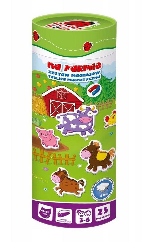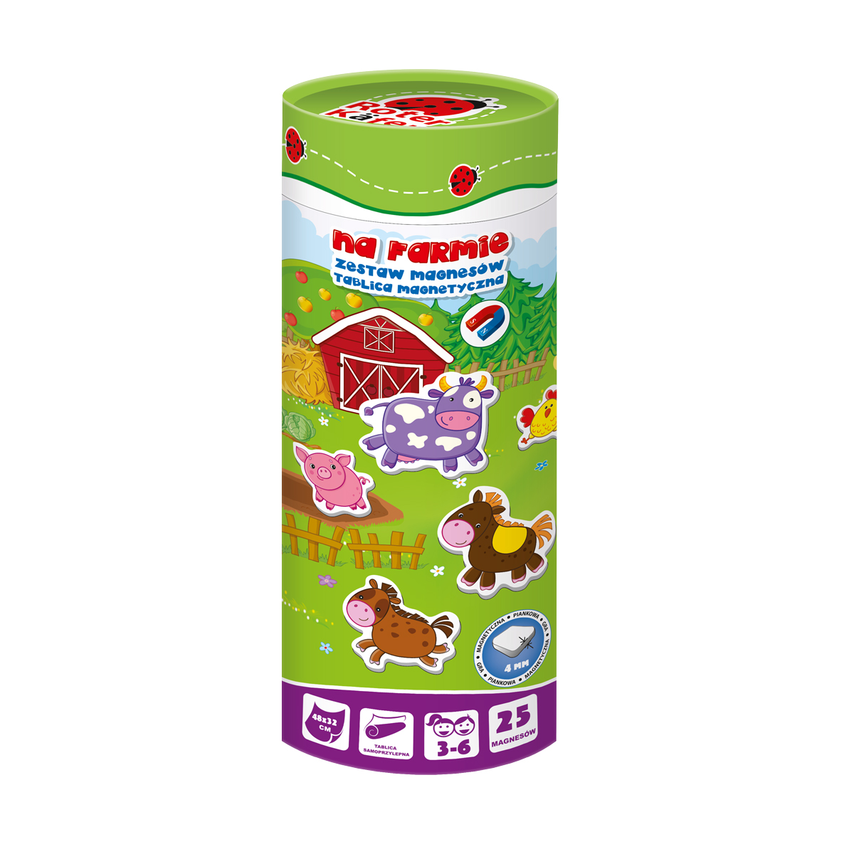 Gra zawiera samoprzylepną podstawę z obrazem farmy i miękkie magnesy. Dekoracja - podstawa – to pole do gry. Przymocujcie ją do specjalnej magnesowej deski i rozpoczynajcie podróż przez nasza wesołą farmę. Poruszajcie magnetycznymi figurkami zwierząt, umocujcie je na potrzebnym miejscu i wymyślajcie o nich ciekawe historie. Gra rozwija logiczne myślenie, pamięć, mówienie i drobna motorykę.
