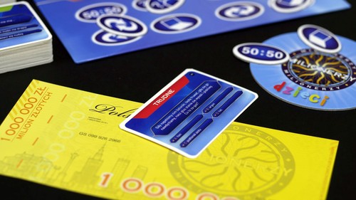 Dynamiczna gra planszowa, w której dorośli i dzieci rywalizują odpowiadając na pytania jak w popularnym teleturnieju. Gra zawiera 4 Koła Ratunkowe, z czego 3 są zupełnie nowe! W zestawie Kart Pytanie i Odpowiedź znajduje się 55 kart z pytaniami obrazkowymi. Możliwość rozgrywki Dorośli v vs Dzieci oraz Dzieci vs Dzieci. Zawartość gry: 1 plansza do gry, 660 kart Pytanie i Odpowiedź (w tym 55 kart obrazkowych), 8 żetonów Kół Ratunkowych, 2 Znaczniki drużyn, 4 pionki, 1 złoty banknot Milionerów.