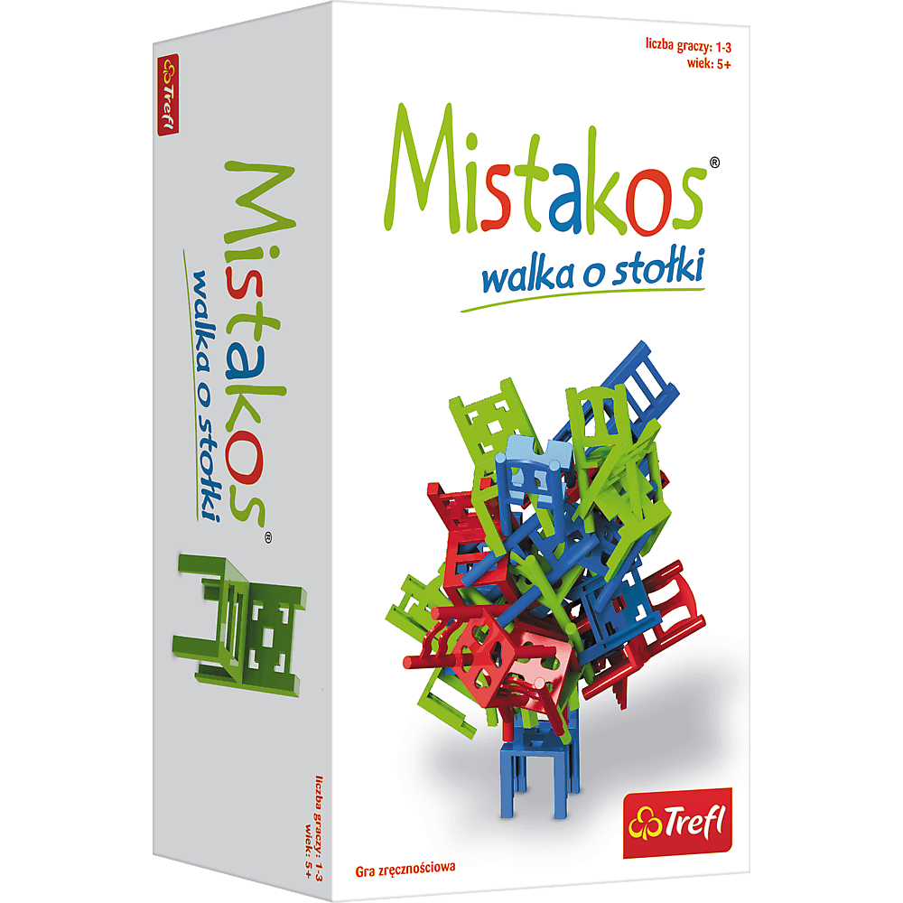 Mistakos - Walka o stołki! Czas na zwariowane meblowanie! Wybierz krzesło w swoim kolorze i ustaw je na poprzednim tak, żeby nie spadło na stół. Kto pierwszy skusi i dostanie punkty karne? Świetna zręcznościowa zabawa dla graczy w każdym wieku.