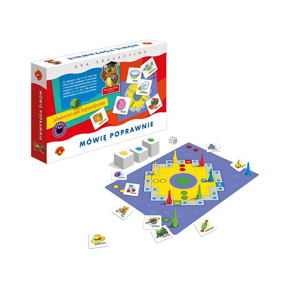 Każdy z graczy otrzymuje po 2 pionki. Poruszając sięnimi po torze zgodnie z rzutami kostką, gracze starająsię jak najszybciej ustawić je w wyznaczonychmiejscach wewnątrz planszy.W emocjonującym wyścigu jego uczestnicy mogąsobie pomóc wymawiając poprawnie wyrazy,zgodnie z obrazkiem i napisem, na odkrywanychkolejno tabliczkach. Gra wciąga dzieci wemocjonującą zabawę, a przy okazji jest pretekstemdo nauki poprawnej wymowy głosek.