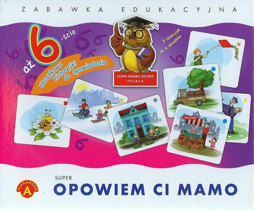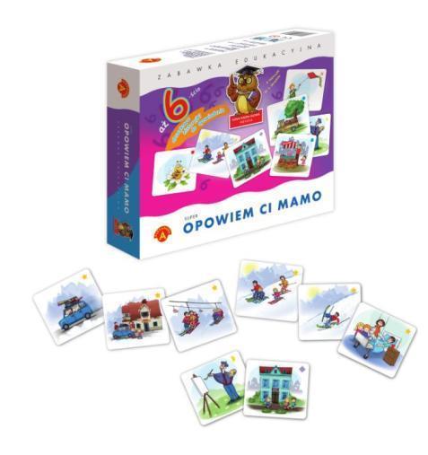 Opowiem Ci Mamo - super"" to kolejna wersja cieszących się dużym powodzeniem zabawek dydaktycznych przeznaczonych dla dzieci od 3 lat. Pudełko zawiera 48 obrazków, z których należy ułożyć 8 logicznych historyjek. Każdą z nich dziecko ma opowiedzieć jak umie najlepiej swojemu towarzyszowi zabawy. Tym razem układanie i opowiadanie historyjek wymaga większego wysiłku, ponieważ każda z nich składa się aż z 6 obrazków.Zabawka rozwija wyobrażnię i umiejętność wypowiadania się,uczy rozumienia następst czasowych i logicznego myślenia. Usprawnia też spostrzegawczość i analizę wzrokową.