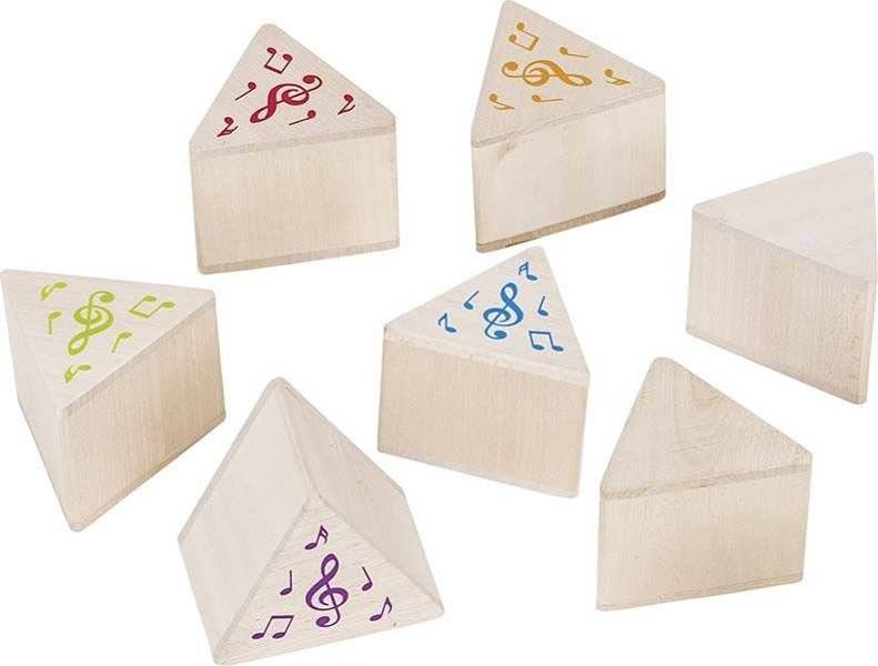 Zestaw 12 klocków oznaczonych kolorowymi nutkami. Do każdego klocka wbudowany został dzwoneczek. Zadaniem dziecka jest odnalezienie dwóch klocków wydających identyczny dźwięk. Zabawka rozwija słuch malucha oraz ćwiczy jego pamięć. Wymiary produktu:11,5 x 13 x 15 cm Wymiar jednego klocka: 7 x 7 x 7 cm