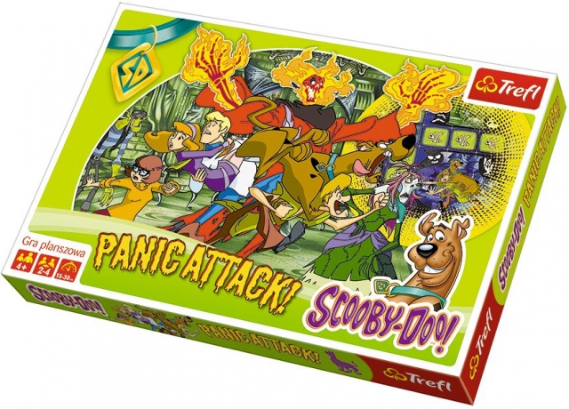 Panic Attack!Scooby-Doo po raz kolejny stara się rozwikłać straszne zagadki. Niestety, przeszkadza mu w tym przerażający duch, który wzbudza w Scoobym paniczny strach. Pomóżcie mu pokonać przerażenie i zdemaskujcie wszystkie potwory!Wraz z innymi graczami uciekajcie Scoobym przed płonącym duchem. Korzystajcie z pomocy Kudłatego, Welmy, Daphne i Freda aby sprawnie rozwiązać zagadki. Miejcie się na baczności, nigdy nie wiadomo, gdzie następnym razem pojawi się duch!Kto z Was pomoże Scoobyemu na tyle opanować strach, aby rozwiązał najwięcej zagdek i zdobył najwięcej uznania wśród swoich przyjaciół?Zawartość pudełka: plansza do gry 2 pionki: Scooby-Doo i duch 2 podstawki pod pionki 45 żetony kostka do gry instrukcja