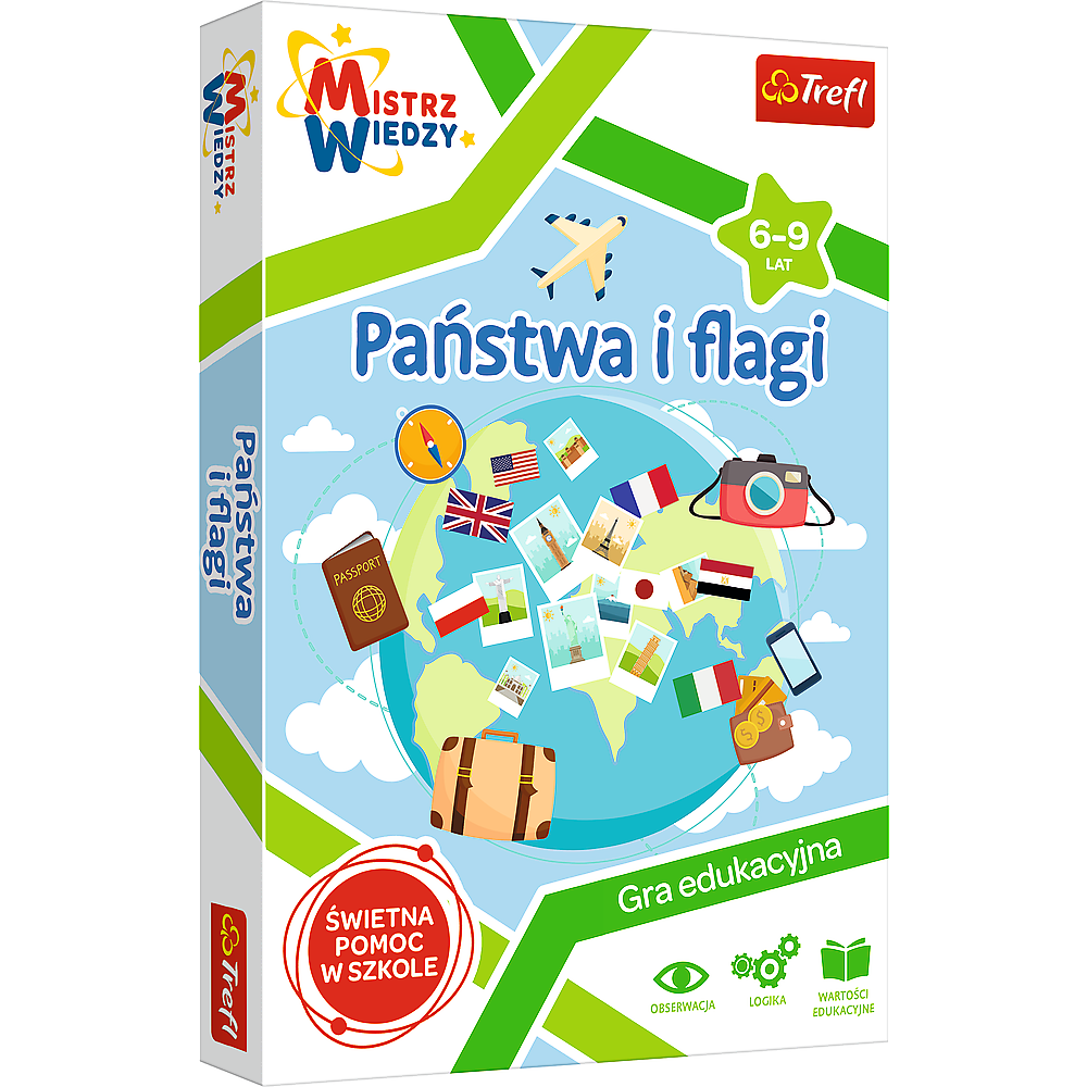"Państwa i flagi" to wspaniała rozrywka dla młodych podróżników i wielbicieli geografii. Gra edukacyjna dla 1-4 osób. Świat jest wielki i na pewno nie wszędzie uda Wam się pojechać. A może jednak? Przynajmniej w wyobraźni? Mali podróżnicy już teraz mogą poznać odległe zakątki ziemskiego globu. Zawartość: dwustronna plansza 4 pionki 56 kart z pytaniami 28 żetonów plakat instrukcja Wiek 6-9 lat