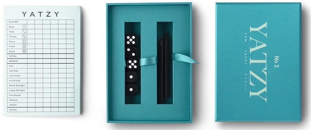 W zestawie znajduje się 5 czarnych kości i 2 czarne ołówki oraz 50-stronicowa karta wyników.
