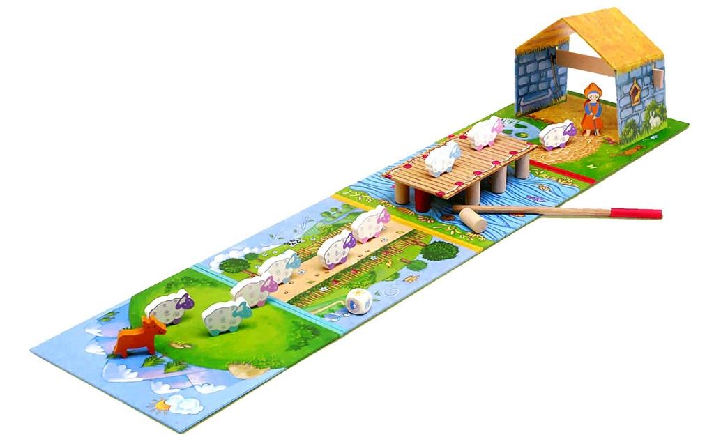 Gra towarzyska ""Pastuszek i owce""Zawartość opakowania:-1 zestaw 4 plansz-owczarnia z drewnianymi belkami-most,-10 drewnianych części (filarów mostu)-drewniany patyk,-owczareczka-9 owiec, pies, kostka.Cel gry:Przeprowadzić bezpiecznie owczareczkę, jej owce i psa przez most zanim zdmuchnie go wiatr.Gra losowa,w której wszyscy gracze graja przeciw wiatrowi.Albo wszyscy wygrywają,albo wygrywa wiatrWiek graczy :4-8 lat.liczba graczy 2-6czas gry ok 15 minWielkość opakowania:30 x 28 x 5 cm