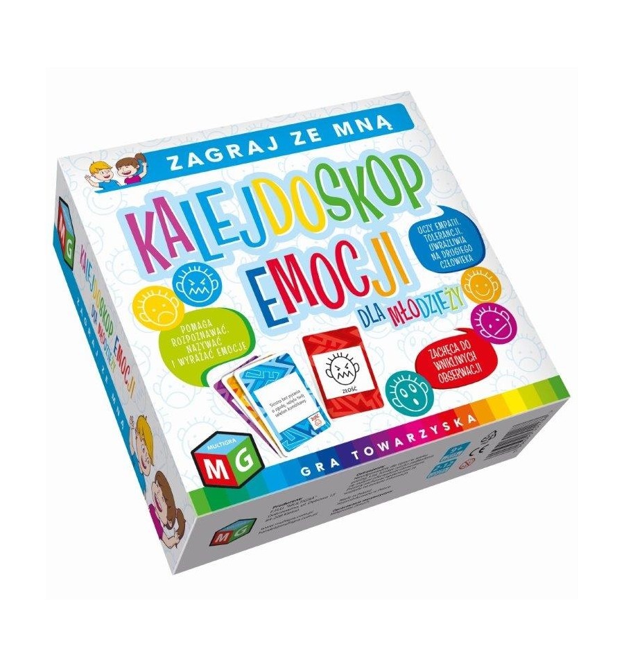 Kalejdoskop emocji dla młodzieży"" to gra towarzyska, polecana uczniom starszych klas szkoły podstawowej i młodzieży. Gra posiada dwa warianty rozgrywki, które w przyjemny sposób uczą rozpoznawania, nazywania i wyrażania emocji oraz zachęcają do wnikliwych obserwacji. "" Kalejdoskop emocji"" uczy empatii, tolerancji, właściwych relacji interpersonalnych, uwrażliwia na drugiego człowieka. Gra wyzwala pozytywne emocje, pobudza wyobraźnię oraz stymuluje umiejętność myślenia przyczynowo- skutkowego. Uczestnicy zabawy ćwiczą spostrzegawczość, koncentrację uwagi i pamięć. Gra rozwija umiejętności werbalne, a także pomaga w rozumieniu sensu informacji podawanych w formie uproszczonych rysunków, symboli. Zestaw zawiera: karty ze zdarzeniami - 72szt, karty z rysunkami twarzy -36szt, plansze do gry w Bingo -6szt, instrukcję.