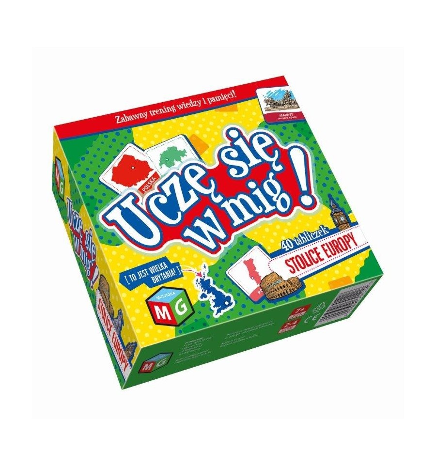 Uczę się w mig. Stolice Europy to wspaniała gra, która rozwinie pamięć i spostrzegawczość Twojego dziecka. Dodatkowo poszerzy jego wiedzę z zakresu geografii i pomoże obudzić w nim naturę prawdziwego podróżnika, zapewniając przy tym dużo dobrej zabawy i emocji. W grze wygrywa ten, kto najlepiej zapamięta położenie par państw i ich stolic, odkrytych na chwilę, spośród wszystkich ilustrowanych tabliczek leżących na stole rewersem do góry. Odkrywaj wiele wspaniałych miejsc i zdobywaj wiedzę o naszych europejskich sąsiadach.