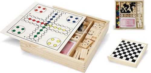 Gra podróżna 5 w 1: mini szachy, mini warcaby, chińczyk, karty i domino. W zestawie znajduje się 5 kości do gry i jedna mała kostka. Całość wykonana z drewna.