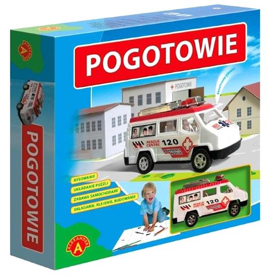 Zabawa w Pogotowie zaczyna się od sklejenia tekturowych budynków potrzebnych do aranżacji zabudowy miejskich ulic. Następnie z puzzli należy ułożyć planszę. Kiedy to się uda, można ustawić na niej sklejone budowle i rozpocząć jazdę karetkami pogotowia, wzywanymi do akcji ratunkowej. Na odwrotnej stronie planszy - puzzli znajdują się kontury znaków drogowych i ich nazwy. Jeśli znudzi się zabawa samochodami na ulicach miasta, można zdemontować planszę, odwrócić puzzle na drugą stronę, a następnie układać je tak, by powstała tablica znaków drogowych. Znaki są czarnobiałe, ale dzięki kolorowym kredkom, znajdującym się w opakowaniu zabawki, można je pokolorować według załączonego wzoru - ucząc się przy okazji ich nazw.