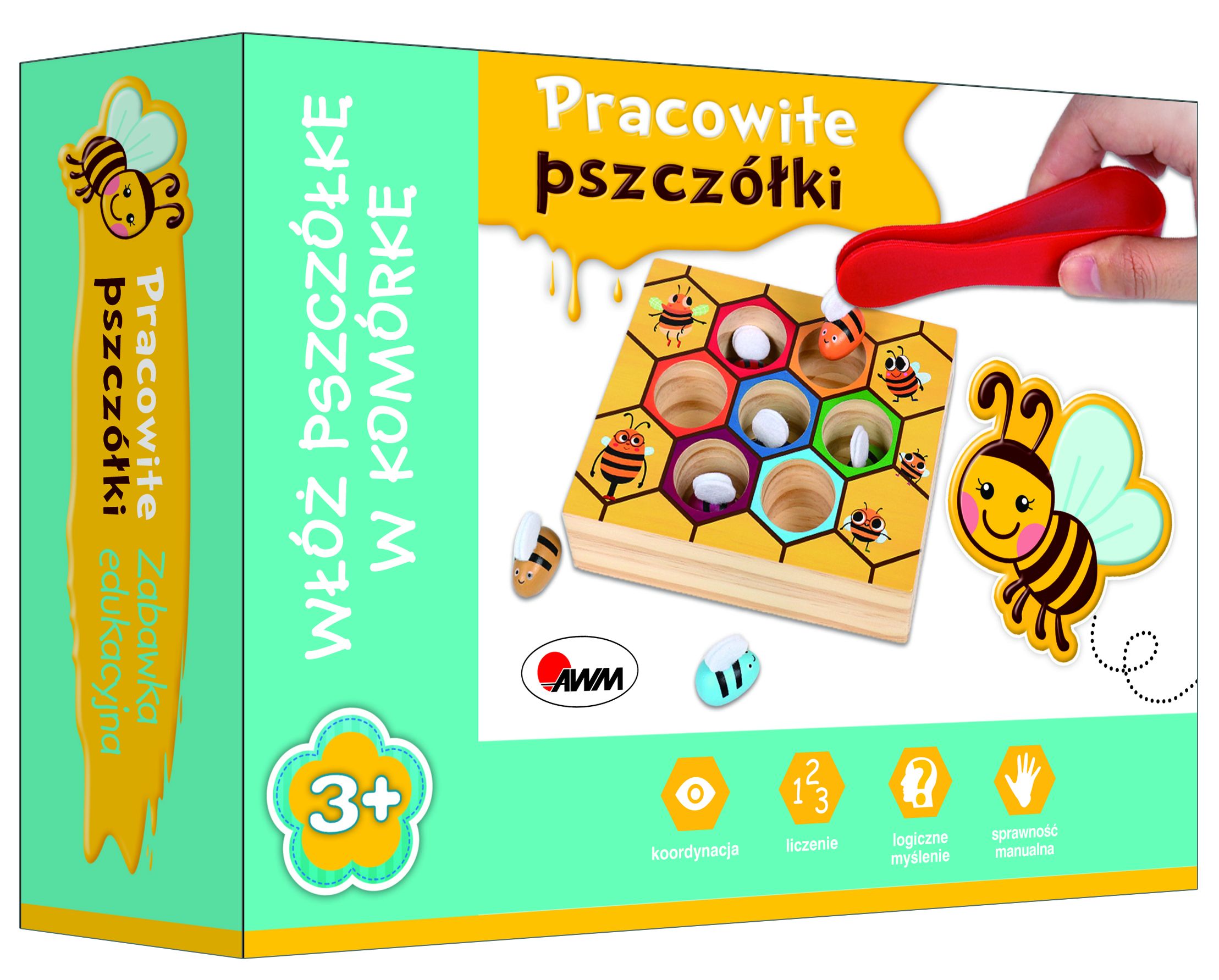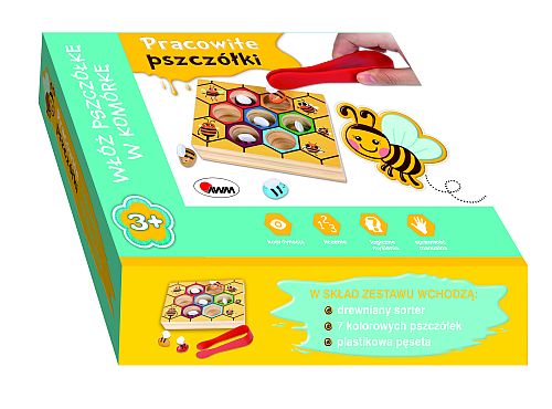 Zabawka, która wspiera ROZWÓJ DZIECKA na wielu płaszczyznach. CHWYTAJ pszczółki pęsetą za skrzydełka; pamiętaj, nigdy tak nie traktuj żywych pszczó-łek! UMIESZCZAJ je w odpowiednich otworach (komórkach) plastra miodu. Powtórz zabawę, starając się wykonywać czynności jeszcze SZYBCIEJ. „Pracowite pszczółki” to solidnie wykonana drewniana zabawka edukacyjna. Zadaniem malucha jest umieszczenie pszczółki w odpowiednim kolorze w oznaczonej tym samym kolorem komórce. Do tego celu służy plastikowa pęseta. Zabawkę można wykorzystać jako grę zręcznościową. Gra ? ćwiczy sprawność i precyzję manualną ? doskonali koordynację oko-ręka ? trenuje koncentrację ? wyrabia refleks ? uczy logicznego myślenia ? utrwala znajomość kolorów ? rozwija wyobraźnię i kreatywność ? zapewnia świetną zabawę