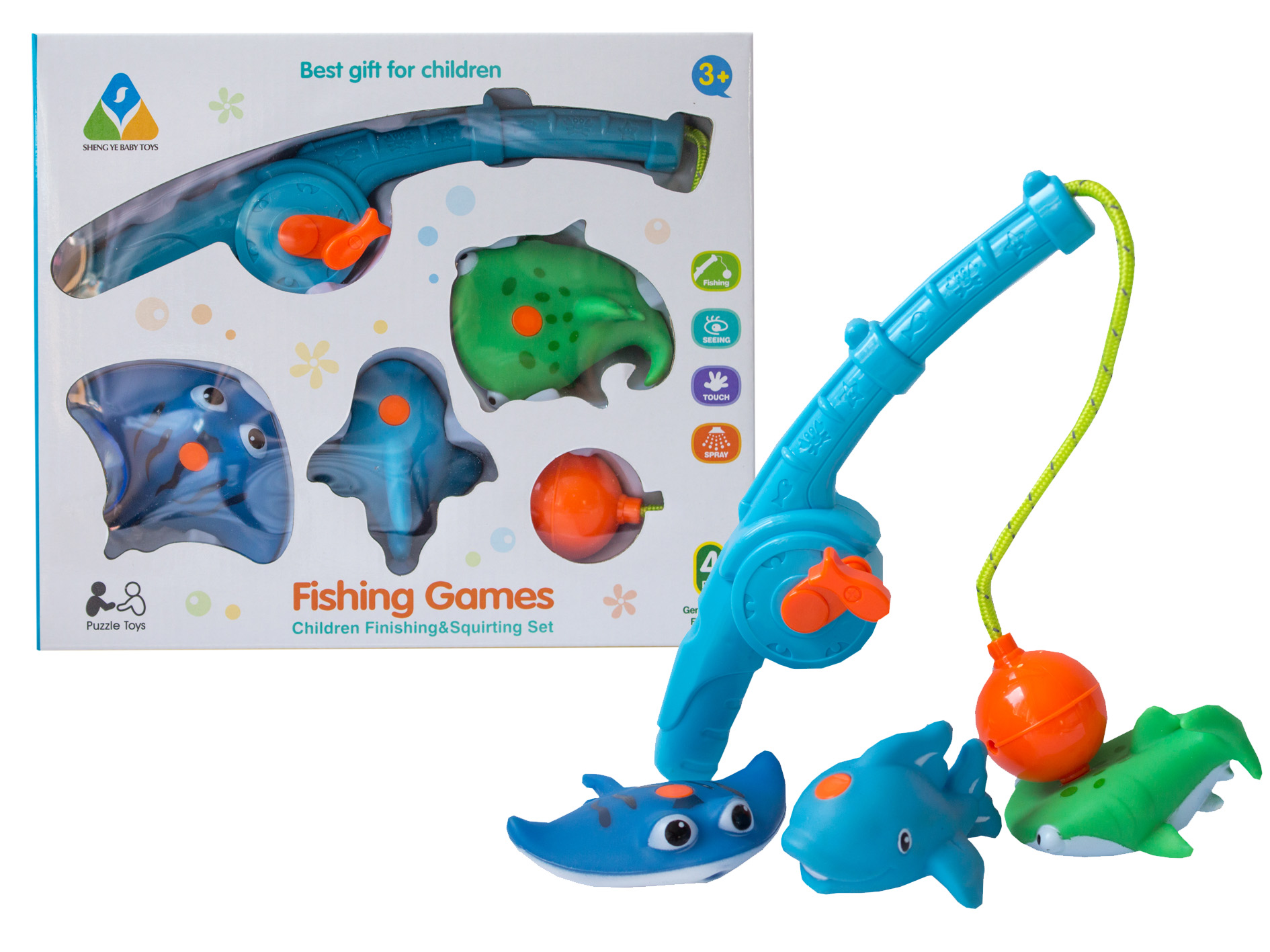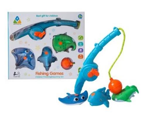 W zestawie 3 gumowe rybki o interesujących kształatch oraz wędka.