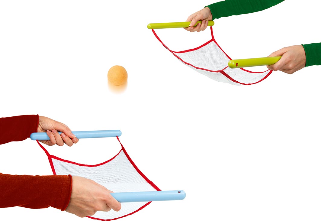 Gra rzuć i złap piłkę. Gra ruchowa dla dzieci polega na rzucaniu i łapaniu piłki. Można w nią grać w pojedynkę lub we 2 osoby. Gra ćwiczy sprawność, koordynację i refleks. Materiał wykonania: drewno, tkanina.