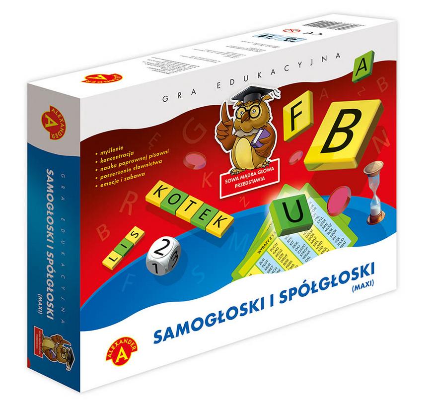 Samogłoski i spółgłoski to gra w dwóch wariantach. W pierwszym wariancie każdy z graczy stara się ułożyć z wylosowanych liter wyraz, który będzie zawierał tyle samogłosek ile wskaże wcześniej rzut kostką. Wygra ten kto będzie układał wyrazy najszybciej i najczęściej. W drugim wariancie gracze tworzą nowe wyrazy poprzez dokładanie wylosowanych liter do wyrazu utworzonego na stole. Gra jest bardzo emocjonująca, zmusza do myślenia, uczy poprawnej pisowni i wzbogaca słownictwo.