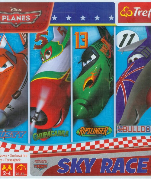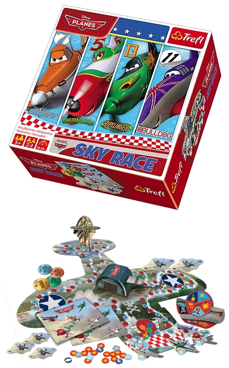 Sky RacePrzygotuj się na wyjątkową przygodę z bohaterami filmu ""Samoloty"". Poszybuj pod obłoki i weź udział w szalonym wyścigu dookoła świata. Zmierz się z innymi uczestnikami izdobądź złoty medal!Zadaniem małych pilotów jest przemierzenie krętej, podniebnej trasy, pokonanie wielkiej góry i dotarcie do mety przed innymi graczami.Trzeba być czujnym bo po drodze czai się wiele przeszkód. Zjawiska atmosferyczne takie jak mgły, burze i ciemne chmury, wywołane przez innych graczy, mogą utrudnić przelot. Opóźnić gomożetakże nieprzewidziana awaria.Bądź cierpliwy! Przy odrobinie szczęścia, na pomoc w zmaganiach przybędzie dzielny i uczynny Dusty.Dużym atutem gry jest piękna grafika w stylu Disneya oraz przestrzenna plansza w kształcie samolotu, ze śmigłem losującym na dziobie.