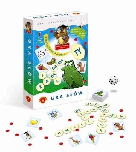 "Gra słów" to zestaw gier słownych i zabawa dla dzieci poznających litery. W zabawie dla najmłodszych, dzieci układają litery do wybranego obrazka, tak by utworzyć jego nazwę. Gry z udziałem liter i obrazków są dla dzieci treningiem spostrzegawczości, koncentracji i refleksu. Gry z tabliczkami literowymi i kostką, to gry słowne dla starszych dzieci i dorosłych. Ta grupa gier, to emocjonująca zabawa, w której gracze wzbogacają swoje słownictwo, doskonalą umiejętności poprawnej pisowni, ćwiczą koncentrację i myślenie. Zawartość pudełka: 96 tabliczek z literami, 40 tabliczek z obrazkami, kostka, 40 żetonów, worek, instrukcja.