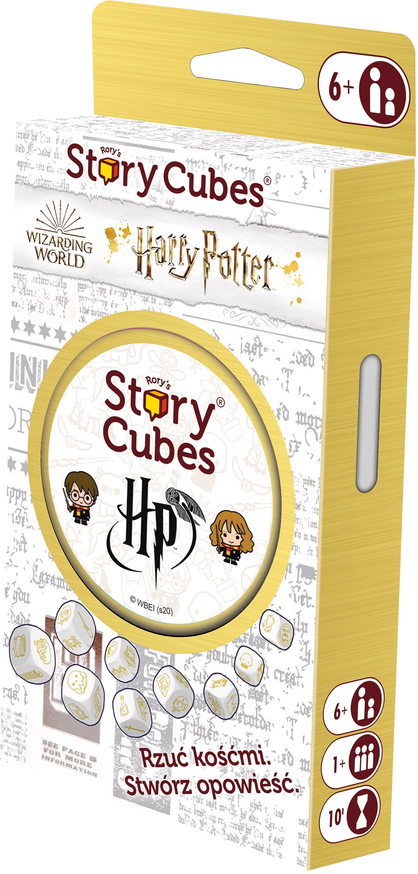 Oto prosta w założeniach i jednocześnie genialna gra, która dostarczy Wam wiele radości, stanowiąc przy tym doskonały trening pomysłowości i wyobraźni. Story Cubes: Harry Potter to 9 estetycznie wykonanych, sześciennych kostek, z których każda zawiera na ściankach odmienny zestaw ilustracji.