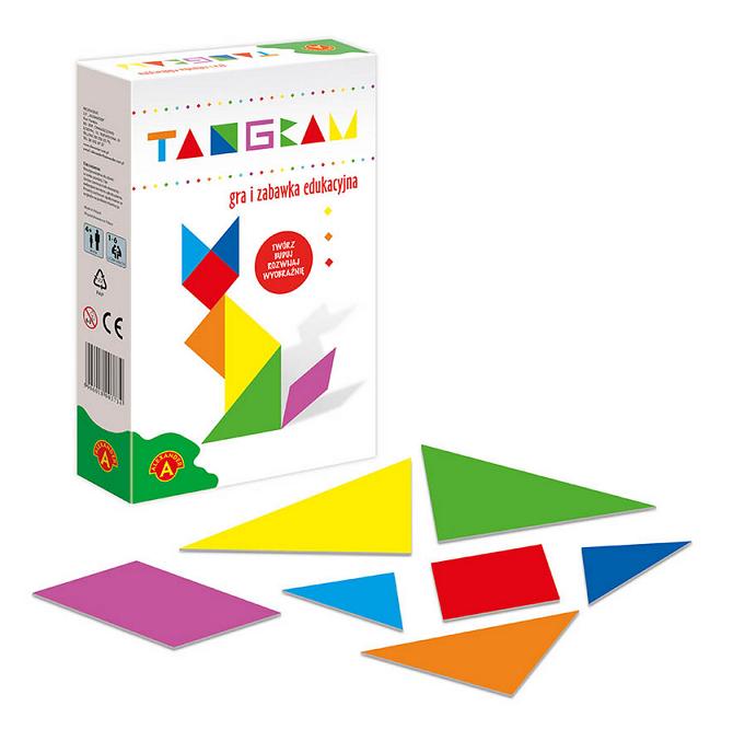 Tangram to chińska łamigłówka znana od ok. 3000 lat. Składa się z siedmiu elementów w postaci figur geometrycznych (tan), powstałych przez rozcięcie kwadratu. Celem łamigłówki jest odtworzenie położenia wszystkich siedmiu elementów tangramu w przedstawionym obrazku na podstawie jedynie kształtu jego konturów, a także wymyślenie własnych wzorów. Proponujemy Tangram nie tylko w wersji zabawki, ale także jako emocjonującą grę w 3 wariantach. Gry Tangram to świetne ćwiczenie wyobraźni, spostrzegawczości, koncentracji i pamięci.Zawartość pudełka: 12 dużych trójkątów prostokątnych, 6 średnich trójkątów prostokątnych, 12 małych trójkątów prostokątnych, 6 kwadratów, 6 równoległoboków, 60 żetonów, instrukcja.
