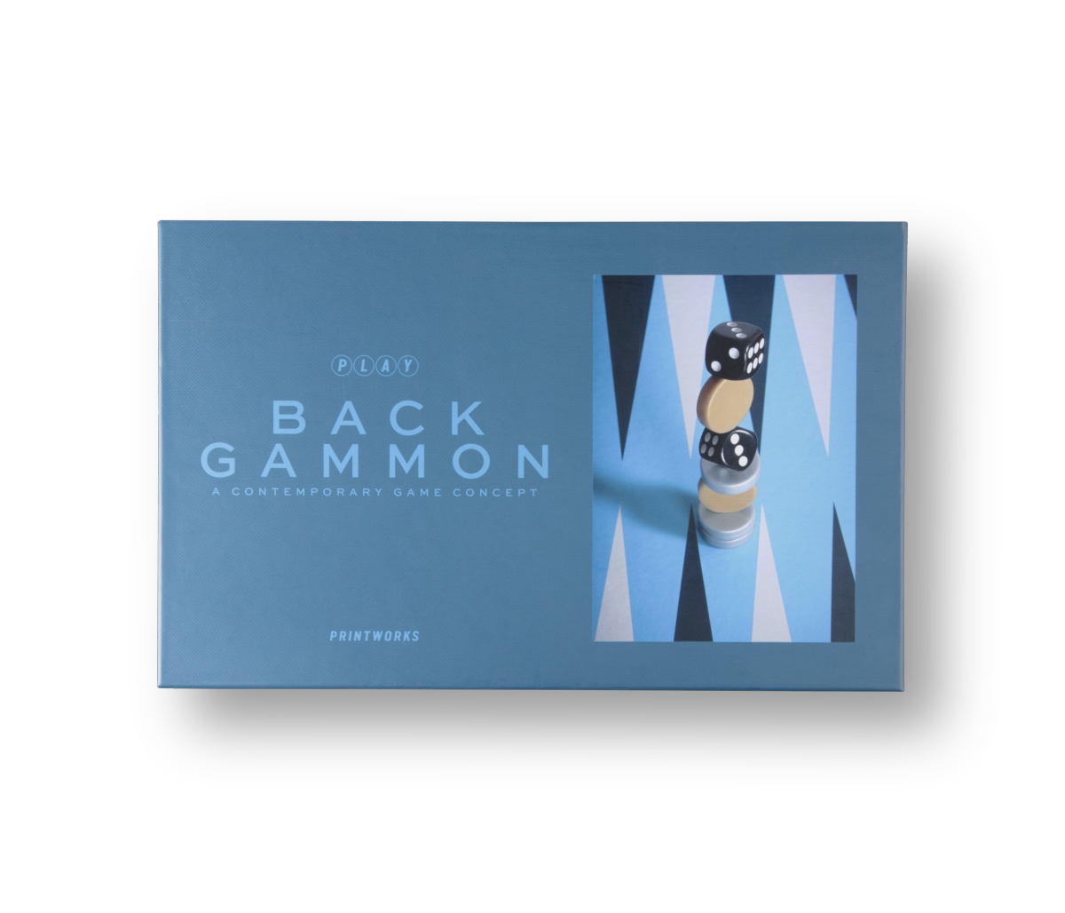 W komplecie Backgammon Play marki Printworks znajdziesz planszę do gry, 15 okrągłych złotych pionków, 15 okrągłych pionków srebrnych, 4 czarne kości do gry i 1 czarną kość dublującą.