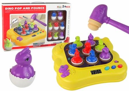 Gra Zręcznościowa Uderz Młotkiem Dinozaury Kolorowe Nasza gra to niezwykła zabawa dla całej rodziny. Polega na zbijaniu kolorowych dinozaurów, każdego oznaczonego numerem. Plansza w kolorze żółtym zawiera miejsca na ustawienie dinozaurów zgodnie z numeracją. Mamy 8 dinozaurów, które ma swoją nazwę i reaguje dźwiękowo po uderzeniu młotkiem, odtwarzając muzykę i odczytując swoją nazwę. Gra oferuje 48 poziomów, a każdy z nich zawiera 20 dinozaurów, co zapewnia długotrwałą rozrywkę. Możesz wybrać poziom prędkości, dostosowując grę do swoich preferencji i umiejętności. Zabawka zapewnia opcję gry zarówno w pojedynkę, jak i w dwie osoby, co sprzyja wspólnej zabawie. Nasza gra nie tylko rozwija zdolności motoryczne dziecka, ale także poszerza wiedzę o dinozaurach. To idealna zabawa edukacyjna dla dzieci i dorosłych. Wymiary pudełka: 50cm x 32cm x 8cm Wymiary Planszy: 26cm x 24,5cm x 5,5cm Wymiary młotka: 17cm x 7,5cm Wymiar dinozaura: 6cm x 4cm Posiada certyfikat CE, ponadto jest zgodny z normą EN71. Zabawka przeznaczona jest dla dzieci powyżej 2 roku życia
