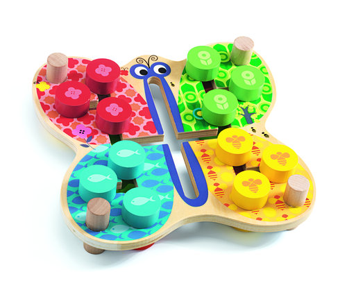 Motylek dwustronna układanka drewniana logiczna. Motyl do nauki kolorów i kształtów-składa się z drewnianej planszy oraz elementów w 4 kolorach w kształcie figur geometrycznych.Polega na rozmieszczeniu kolorowych figur poruszając się po planszy. Wiek +2 lata