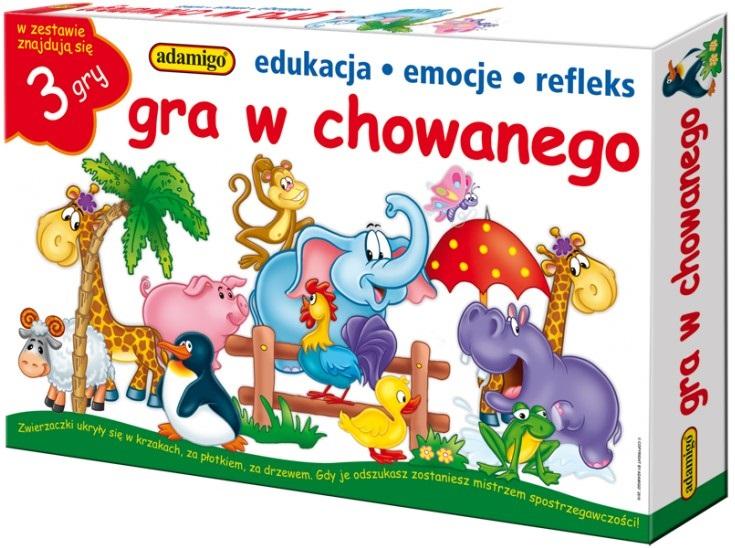 Któż z nas jako dziecko nie uwielbiał zabawy w chowanego? Tym razem możesz zapewnić dziecku emocjonującą rozrywkę w domowym zaciszu. "Gra w chowanego" to emocje, śmiech i pozytywna energia, która rozwija spostrzegawczość, ćwiczy refleks i kształtuje wyobraźnię dziecka. Dzięki grze maluch wyrabia w sobie zdolność analizowania barw i kształtów. Dodatkowo oprócz cech edukacyjnych zestaw dostarcza młodym graczom zabawy pełnej uśmiechu. Zestaw oferuje trzy wesołe, niosące dużo pozytywnych emocji gry. „Gra w chowanego” składa się z 24 sztywnych tafelek , 80 żetonów, a także instrukcję 3 gier. Mały gracz bawi się, a jednocześnie ćwiczy i rozwija swoją pamięć. Wiek graczy: 4+ Liczba graczy: 2-4