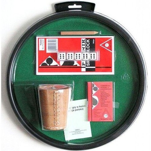 Kompletny zestaw do rozegrania klasycznej partii gry w kości. Tacka z plastikowymi brzegami, wyłożona materiałem. Średnica około 300 mm. W komplecie znajdują się również bardzo dobrej jakości kości do gry Piatnika, kubek na kości, bloczek do notatek oraz polska instrukcja. Zawartość opakowania: tacka w przezroczystym etui komplet 5 standardowej wielkości kostek do gry skórzany kubek do kości bloczek do notatek ołówek do notatek instrukcja Wiek 8+