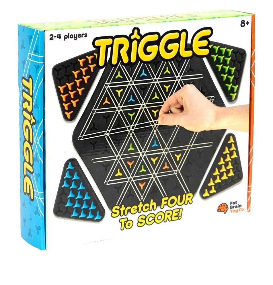 Triggle Gra w Trójkąty Ruchy przeciwnika mogą stać się Twoją wygraną, gdy rozciągniesz swoje strategiczne umiejętności. Celem gry jest oznaczenie swoimi pionkami jak największą liczbę trójkątów, poprzez rozciągnie gumek na kołeczkach znajdujących się na planszy. Podczas każdej kolejki gracz rozciąga jedną gumkę na czterech kołeczkach. Za każdym razem, gdy gracz zamknie trójkąt, zaznacza go w środku swoim pionkiem. Czy jesteś wystarczająco bystry aby oznaczyć najwięcej trójkątów i wygrać? Triggle Gra w Trójkąty: Gra polegająca na zdobywaniu terytorium poprzez oznaczanie trójkątów. Zachęca do rozumowania przestrzennego, strategii, planowania, rozwiązywania problemów, krytycznego myślenia. Jeden ruch to jedno rozciągnięcie gumki na czterech kołeczkach. Kiedy stworzysz trójkąt, przejmij go poprzez włożenie swojego pionka w jego środek. Wygrywa gracz z największą liczbą trójkątów. Zestaw zawiera planszę do gry, 4 tacki pionki, 84 pionki w 4 kolorach. Gra dla 2 do 4 graczy. Dla dzieci od 6 lat +.