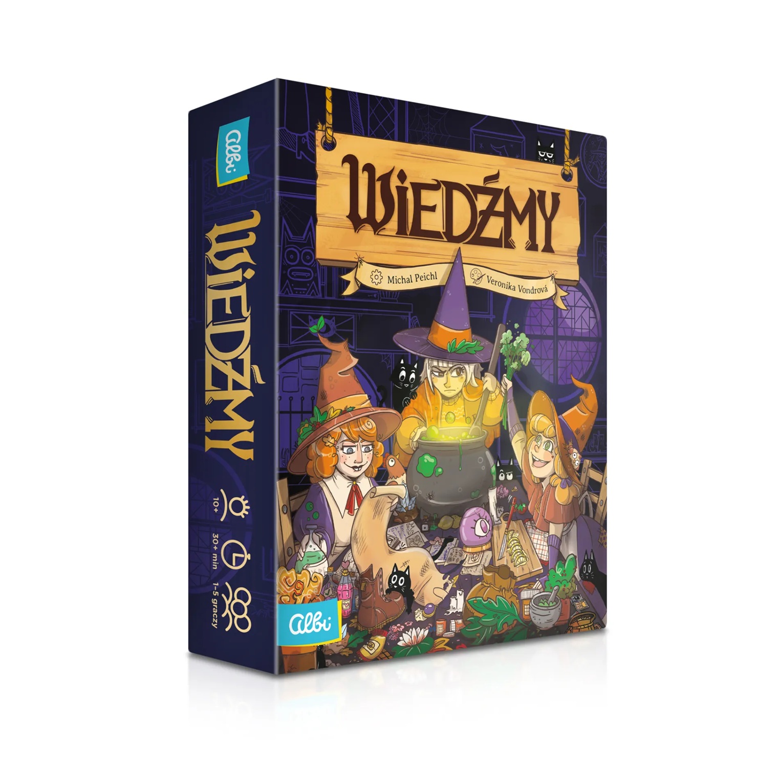 Wiedźmy to gra planszowa, w której przejmujesz kontrolę nad klanem czarownic, starając się pozyskać utalentowane adeptki sztuk magicznych. Wysyłasz swoje wiedźmy po niezbędne składniki i przedmioty, by tworzyć potężne eliksiry. Twoim celem jest zdobycie jak największej liczby punktów. Aby to osiągnąć, musisz gromadzić żetony składników, karty przedmiotów i wiedźm, które następnie pozwolą ci zdobywać karty eliksirów. Jeśli zdobędziesz właściwe zasoby, możesz także realizować żetony celu, przynoszące dodatkowe punkty na koniec gry. Wiedźmy to emocjonująca rozgrywka, w której kluczowe znaczenie mają taktyczne decyzje i doskonałe wyczucie czasu. Czy poprowadzisz swój klan do magicznego triumfu? Autor: Michal Peichl Ilustracje: Veronika Vondrová Zawartość: 1 plansza, 50 kart wiedźm, 50 kart eliksirów, 5 kart eliksirów początkujących, 10 kart nowicjuszek (5 par), 6 kart klanów (w tym 1 do gry solo), 15 żetonów celu, 65 żetonów składników, 9 żetonów do gry solo. Dostępny tryb solo Taktyka i wyczucie czasu Proste zasady, idealny tytuł do rozpoczęcia przygody z planszówkami. Wiek:+10
