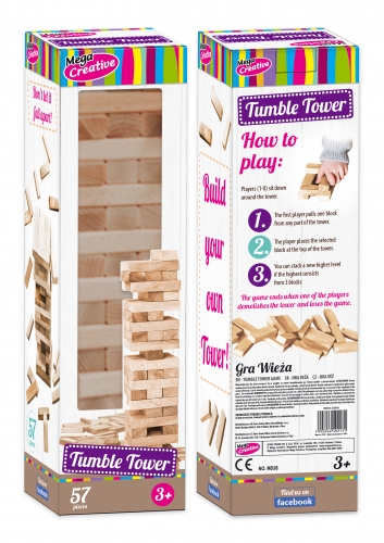 Zalety produktu: rozwija kreatywność dziecka oraz zdolności manualne, pobudza wyobraźnię. Oto prawdziwa gratka dla fanów popularnej gry. Ekscytująca, trzymająca w napięciu rozrywka. Dzięki MEGA CREATIVE zbudujesz wieżę za pomocą drewnianych klocków. Przygotuj się na śmiech i wiele niespodzianek, wyciągaj na zmianę bloki i układaj na górze tak aby wieża nie zwaliła się! Gra zawiera 57 drewnianych bloków. Zawartość zestawu: 57 drewnianych klocków. Gra wykonana z drewna. Wymiary/waga/baterie: wymiary produktu (dł. x wys. x gł.) [cm]: 8x28x8, wymiary opakowania (dł. x wys. x gł.) [cm]: 8x29x8, waga produktu bez opakowania [kg]: 0,96 kg, waga produktu w opakowaniu [kg]: 1,01 kg, nie wymaga zasilania bateriami. Przeznaczona dla dzieci w wieku: 3+. Gra pakowana w kartonik z okienkiem.